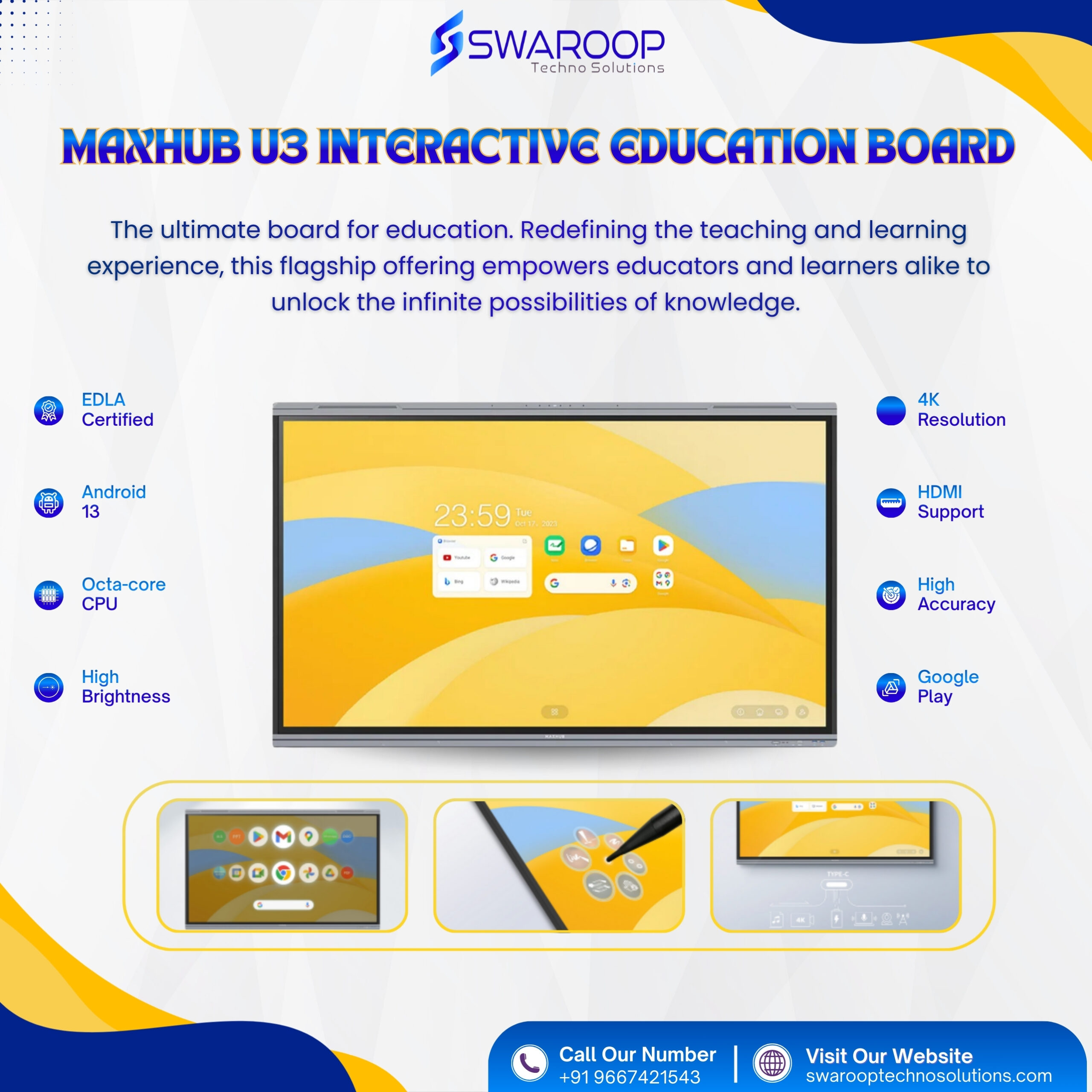 Looking for the perfect display for online teaching? Check out the Maxhub Android 13 Interactive Flat Panel 75 Inch U3 without OPS – featuring a stunning 4K display with a resolution of 3840 x 2160. With its advanced features like intelligent touchscreen technology, 50 points touch, and 8-microphone array, it’s the ultimate tool for an immersive teaching experience. Explore the Maxhub Android 13 and find the best price for the Maxhub 75 Inch Smart Board at swarooptechnosolutions.com. Don’t miss out, enhance your online teaching today!