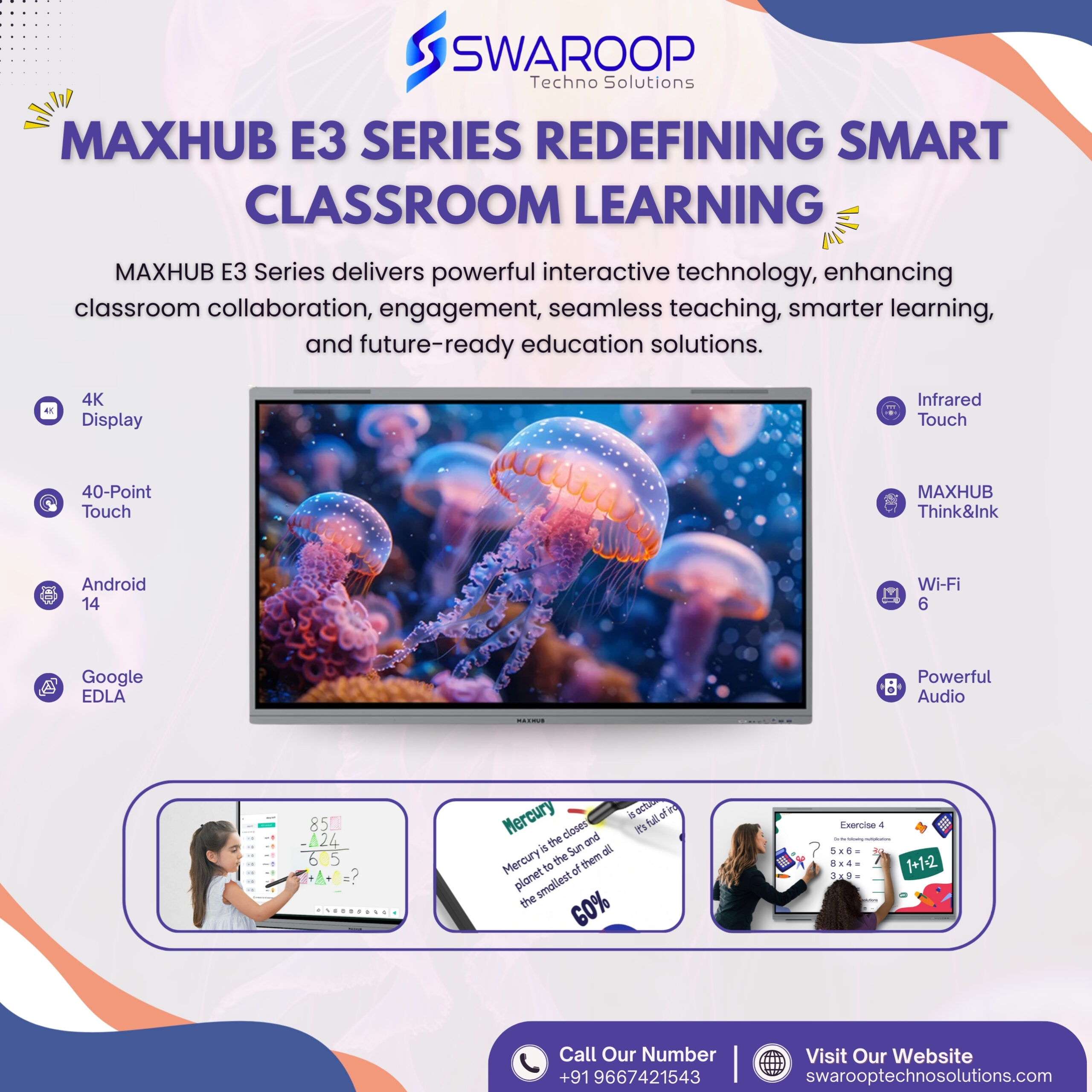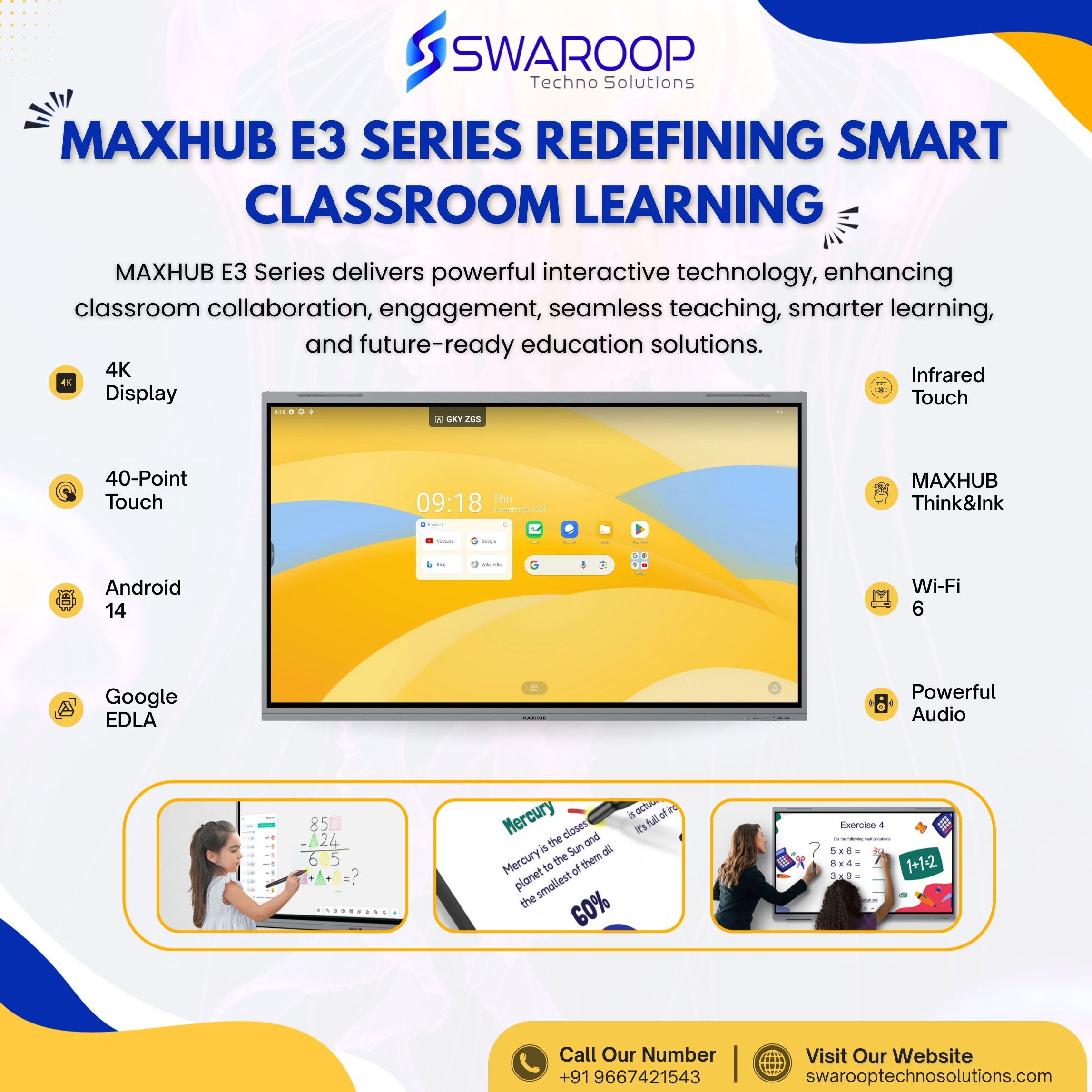 Looking for the perfect display for online teaching? Check out the Maxhub Android 14 Interactive Flat Panel 75 Inch E3 without OPS – featuring a stunning 4K display with a resolution of 3840 x 2160. With its advanced features like intelligent touchscreen technology, 50 points touch, and 8-microphone array, it’s the ultimate tool for an immersive teaching experience. Explore the Maxhub Android 14 and find the best price for the Maxhub 75 Inch Smart Board at swarooptechnosolutions.com. Don’t miss out, enhance your online teaching today!